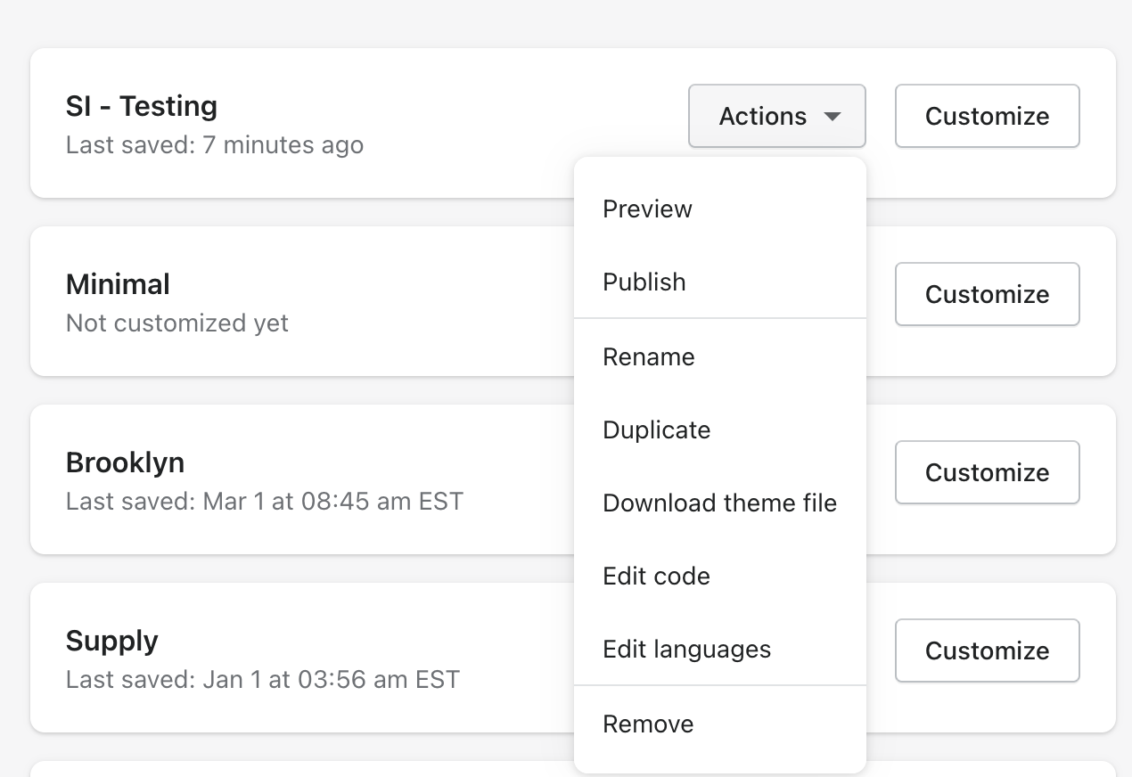 - Duplicate your live theme, Click on Actions > Duplicate.